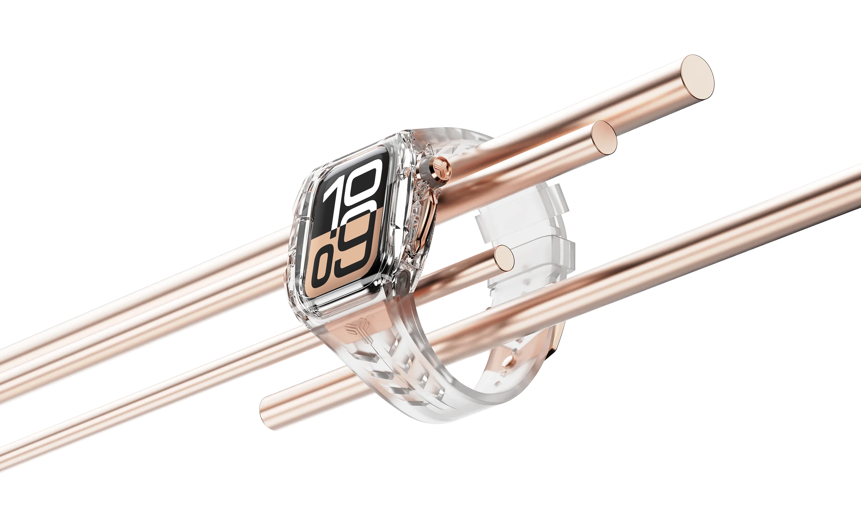 洗練された透明感を放つクリアケースから覗くスチールのディテールが、アクセントとなり、魅力的なデザインを際立たせます。