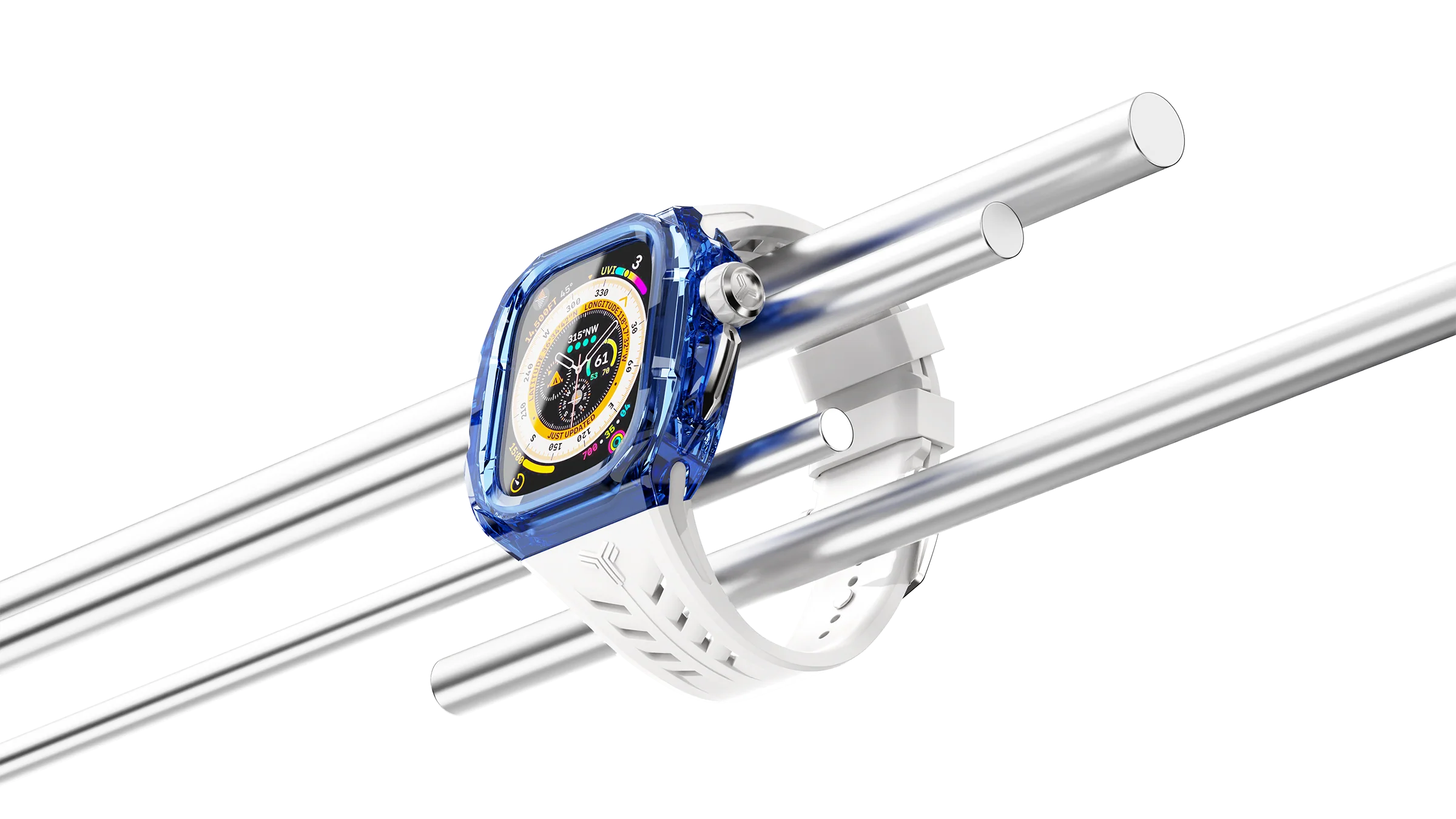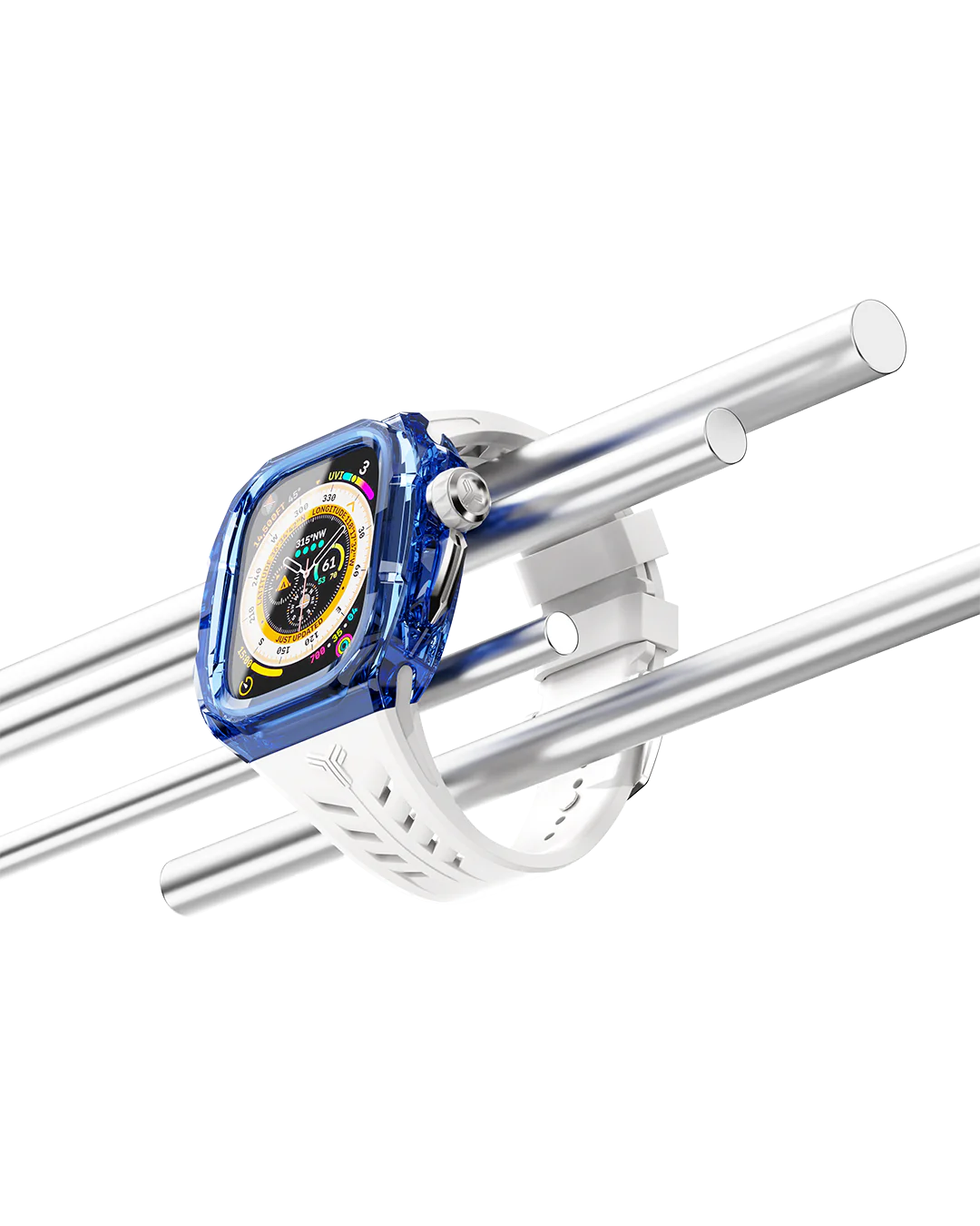 ブルーに染まったクリアケース、シルバーのディテール、ホワイトストラップが一体となり、洗練された印象を醸し出しています。
