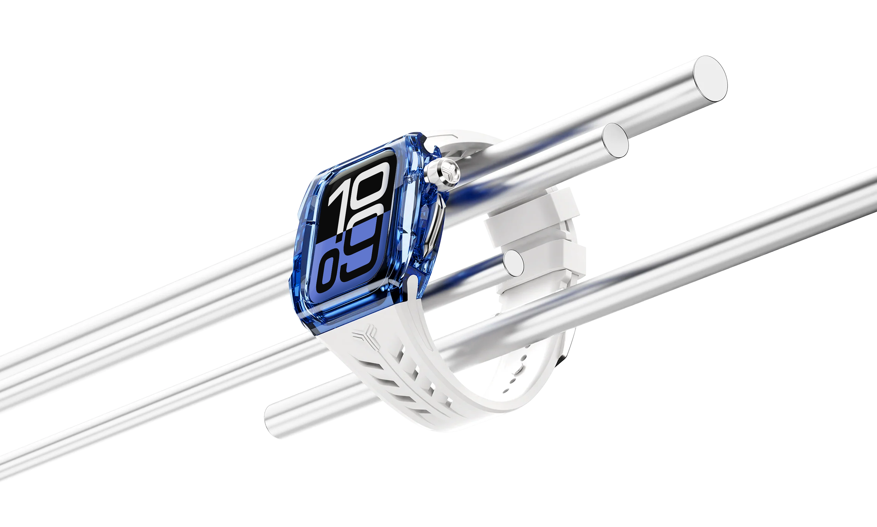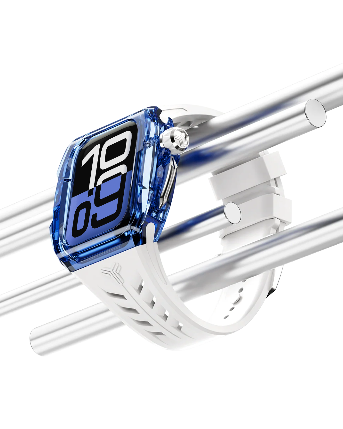 ブルーに染まったクリアケース、シルバーのディテール、ホワイトストラップが一体となり、洗練された印象を醸し出しています。