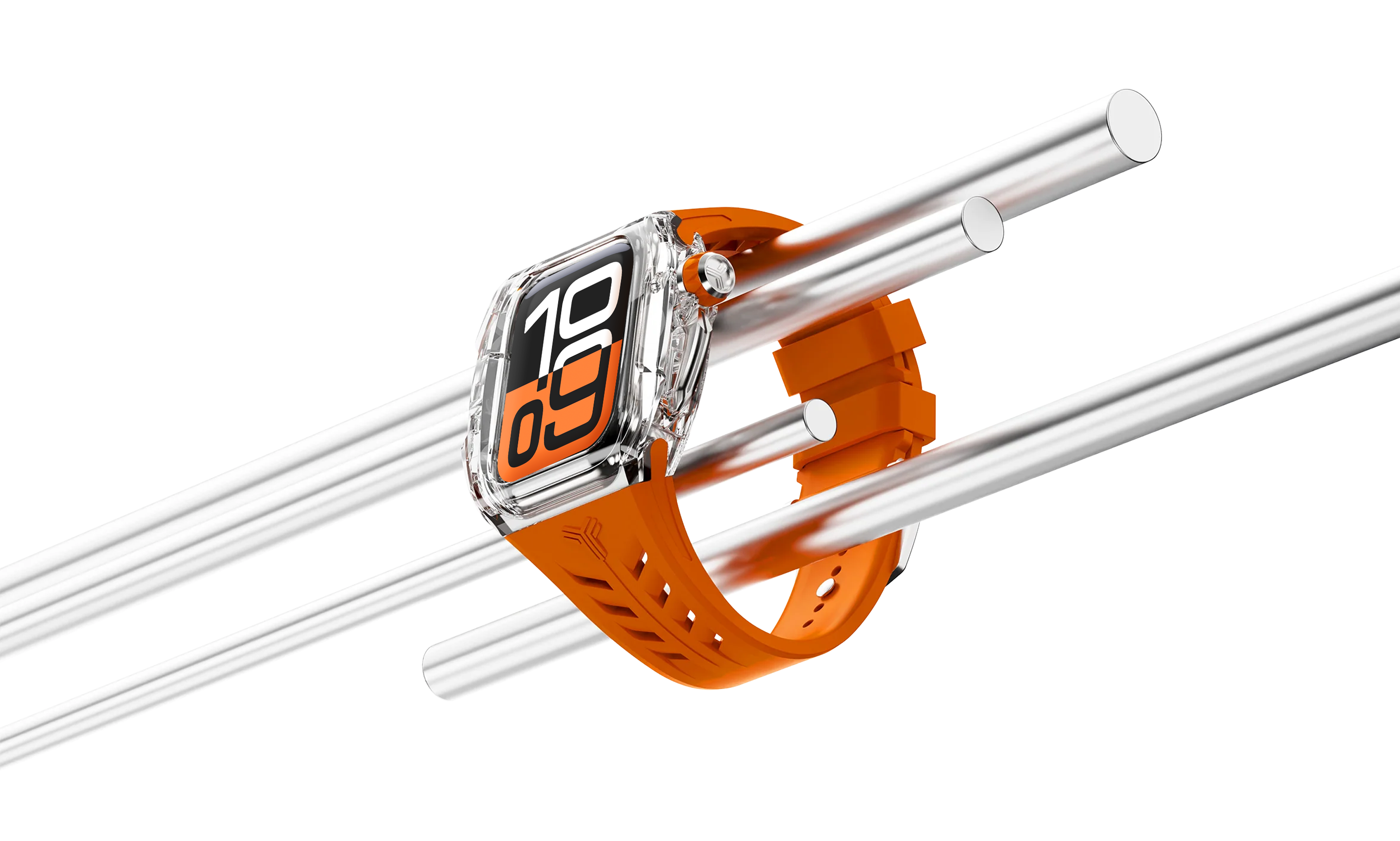 鮮やかなオレンジストラップと透明なクリアケースが、洗練された存在感を放ちます