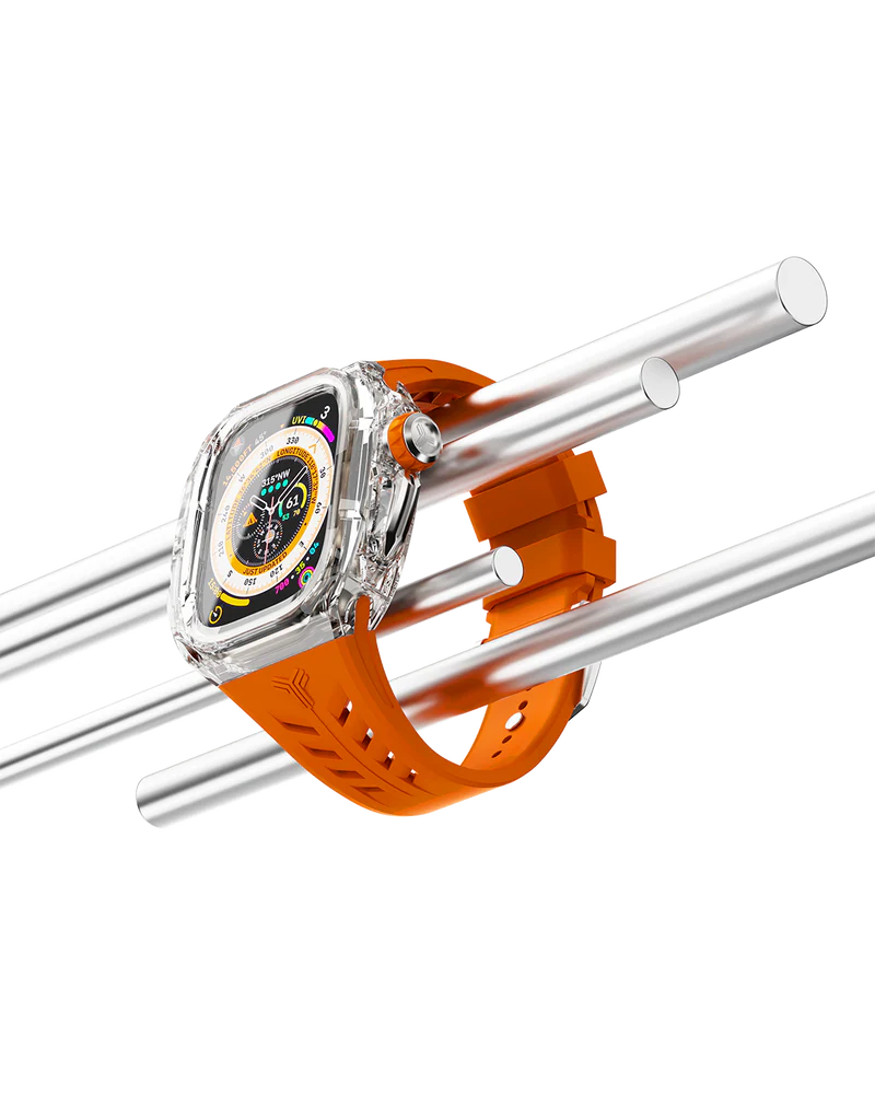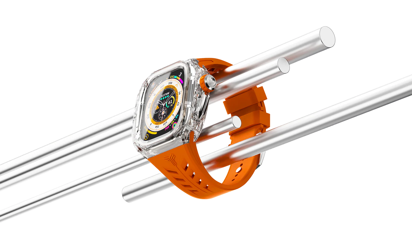 鮮やかなオレンジストラップと透明なクリアケースが、洗練された存在感を放ちます